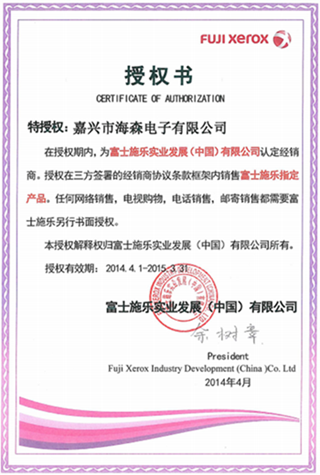 2014年4月富士施乐授予嘉兴海森电子为富士施乐(中国)有限公司认定经销商。